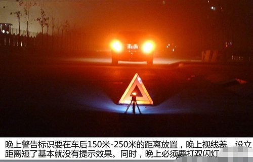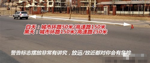 白天在一般城市環(huán)路時要把警示牌立在車后50米的地方,如果是高速路則要樹立在車后150米的地方(大約成年人200步的距離);如果是在黑天,城市環(huán)路遇到車輛故障,需要把警示牌設立在車后100米的地方,而在高速路則要設置在250米的位置(大約成年人走300步的距離)。