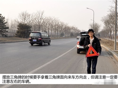 在設(shè)立三角警示牌的時(shí)候你要雙手拿著警示牌,反光面向外,向來車方向走,這樣做是特別是在晚上后車燈光照到三角牌上反射過去更早的提醒后車注意避讓,當(dāng)然,出現(xiàn)事故后你在車內(nèi)一定要把雙閃警示燈打開!