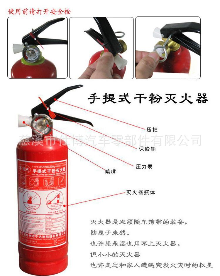 使用說明:使用前,首先要上下顛倒數(shù)次,使干粉預先松動,離火源3-4米時,拔出保險銷,一手握住噴咀,對準火源,另一只手的大拇指按下壓把,干粉即刻噴出。