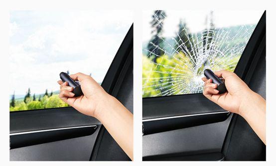 (2)破窗器結(jié)構(gòu)較復(fù)雜,手持破窗器,對(duì)準(zhǔn)車窗四角,即可破窗。
